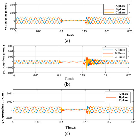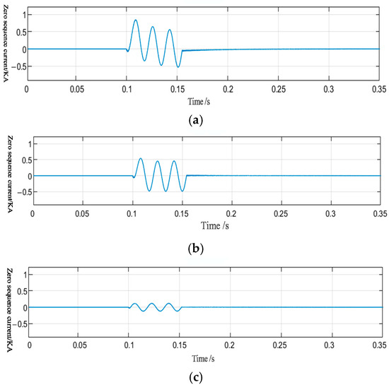 Zero-sequence current at different ground resistances. (a) The ground resistance is 0.1 Ω. (b) The ground resistance is 10 Ω. (c) The ground resistance is 100 Ω.
