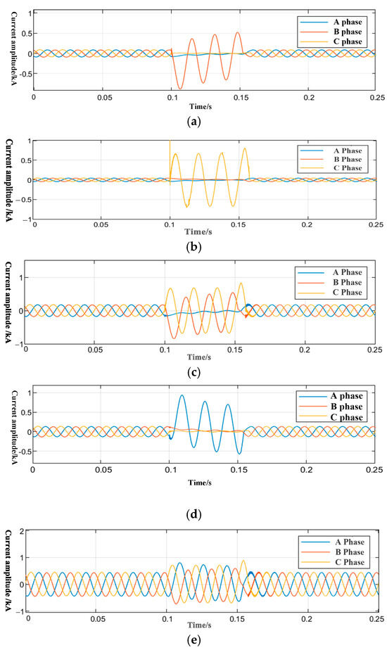 It can be seen from Figure 11 that the fault three-phase waveforms measured at point C are the superposition of the fault waveforms of the C-C’ line and the E-E’ line. Similarly, the three-phase fault waveforms measured at point A are the superposition of all the fault waveforms in this experiment.