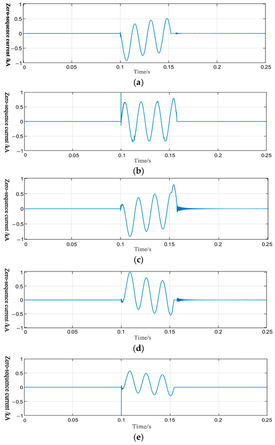 The zero-sequence current waveforms at each measurement point. (a) The waveform at point E. (b) The waveform at point C’. (c) The waveform at point C. (d) The waveform at point I. (e) The waveform at point A.