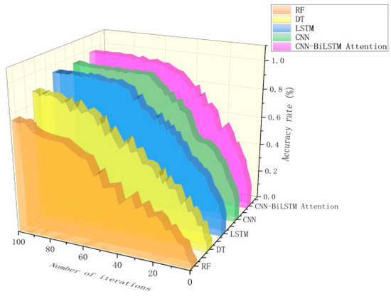 The CNN–BiLSTM–attention architecture achieves 98.96% precision at 59 iterations, demonstrating superior convergence speeds and stability. Comparatively, the LSTM model attains 97.15% accuracy after 63 iterations, followed by the CNN (95.97% at 66 iterations). Conventional methods show slower convergence: decision trees reach 82.83% at 79 iterations, while random forests plateau at 78.76% after 92 iterations. These results quantitatively confirm the proposed model’s enhanced fault localization capabilities.