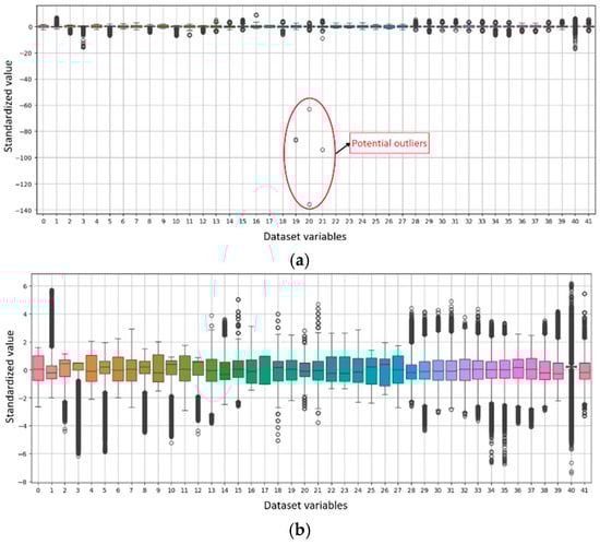 Processing of outliers visualized in boxplot: (a) before and (b) after outliers’ clearance.