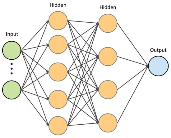 An artificial neural network (ANN) is a computational model inspired by the structure of the brain, which consists of large numbers of interconnected neurons that process information through weighted connections [47]. It is a universal function approximator that can model complex nonlinear relationships between inputs and outputs [33]. It consists of multiple layers that transform the input features progressively using neurons (weights and biases). An ANN type of feed-forward neural network is used in this study, as illustrated in Figure 4.