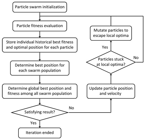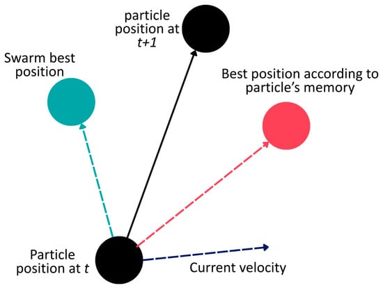 with as the learning rate, as the encoded optimizer, and as the number of nodes, activation function, and dropout ratio in layer for hidden layers. The position and velocity vectors () for the particles are then initialized using uniform distribution from the search space, with as the number of populations, as the number of hyperparameters embedded in each particle, and as the total number of particles per population. The fitness function () for particle in population is evaluated from the ANN validation loss . The position and velocity of each particle is then updated for each iteration, and the global position at the last iteration is determined as the most optimal hyperparameters. More about PSO will be discussed in Section 2.5.