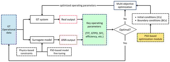 Gas turbine (GT) modeling and optimization have been widely studied at the design level but still lacks focus on real-world operational cases. The concept of a digital twin (DT) allows for the interaction between operation data and the system dynamic performance. Among many DT studies, only a few focus on GT for thermal power plants. This study proposes a digital twin prototype framework including the following modules: process modeling, parameter estimation, and performance optimization. Provided with real-world power plant operational data, key performance parameters such as turbine inlet temperature (TIT) and specific fuel consumption (SFC) were initially unavailable, therefore necessitating further calculation using thermodynamic analysis. These parameters are then used as a target label for developing artificial neural networks (ANNs). Three ANN models with different structures are developed to predict TIT, SFC, and turbine power output (GTPO), achieving high R2 scores of 94.03%, 82.27%, and 97.59%, respectively. Physics-informed neural networks (PINNs) are then employed to estimate the values of the air–fuel ratio and combustion efficiency for each time index. The PINN-based estimation resulted in estimated values that align with the literature. Subsequently, an unconventional method of detecting alarms by using conformal prediction were also proposed, resulting in a significantly reduced number of alarms. The developed ANNs are then combined with particle swarm optimization (PSO) to carry out performance optimization in real time. GTPO and SFC are selected as the primary metrics for the optimization, with controllable parameters such as AFR and a fine-tuned inlet guide vane position. The results demonstrated that GTPO could be optimized with the application of conformal prediction when the true GTPO is detected to be higher than the upper range of GTPO obtained from the ANN model with a conformal prediction of a 95% confidence level. Multiple PSO variants were also compared and benchmarked to ensure an enhanced performance. The proposed PSO in this study has a lower mean loss compared to GEP. Furthermore, PSO has a lower computational cost compared to RS for hyperparameter tuning, as shown in this study. Ultimately, the proposed methods aim to enhance GT operations via a data-driven digital twin concept combination of deep learning and optimization algorithms.