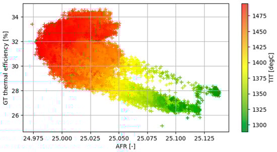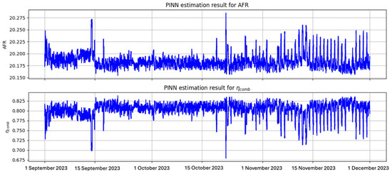 where represents turbine inlet temperature (TIT). Both and lower heating value are provided in the dataset. But, AFR and remain unknown and, hence, will be estimated using PINN, as detailed in Section 2.4. This method would be beneficial for offline monitoring as AFR and are the indicators for combustion performance that are not measuring in the current operation.