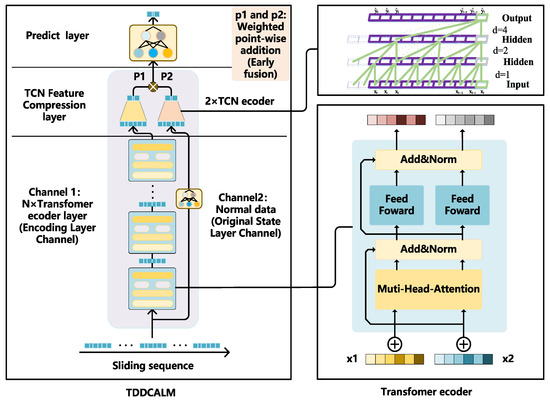 Perform feature extraction on the above two channels separately. Channel 1 integrates attention mechanism and contains global dependency information of input sequence elements. The output data has discreteness, and although there is positional encoding to represent element positions, some sequential features may still be missing. Channel 2 possesses the sequential features missing from channel 1, but cannot represent the global dependencies of individual elements. The emphasis of the two is different, and this article believes that the above two features should be involved in training simultaneously. Based on the above ideas, this article proposes the TDDCALM. TDDCALM feeds channel 1 and channel 2 into two TCN encoders for feature compression, and performs adaptive weighted early fusion on the compressed features. In Channel 2, the primary purpose of applying a linear transformation layer to raw data is to extract and enhance useful features. Although these features originate from the original data, linear transformation enables more effective identification of underlying patterns or relationships within the data structure. This operation improves learning efficiency and representation quality in subsequent TCN layers. Furthermore, linear transformation facilitates partial normalization of data distribution discrepancies, thereby enhancing model generalization capabilities. Simultaneously add ACON adaptive activation function layer instead of ReLU. The depth of the model helps to obtain more complex temporal fluctuation characteristics, while the width of the model (i.e., two channels) enables the TDDCALM to use an adaptive weighted early fusion mechanism to allocate channel weights reasonably, thereby adapting to sequence prediction tasks with different fluctuation characteristics. The basic structure of the TDDCALM is shown in Figure 1, which may be more concise compared to Transformer: