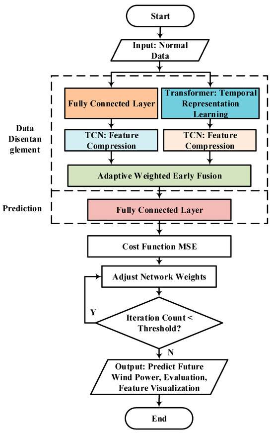The forecasting tasks for wind power can be divided into three categories based on time scale: ultra short term (minute level), short term (hour level), and regional day ahead forecasting. Among them, ultra-short-term forecasting focuses on real-time processing of high-frequency data, while short-term forecasting requires a balance between accuracy and computational efficiency. Current research on ultra-short-term and short-term wind power forecasting has continued to deepen in aspects such as model improvement and combination, feature extraction, and interpretability. Regarding predictive model applications, early research relied heavily on statistical models (such as autoRegressive integrated moving average (ARIMA), support vector machine (SVM)), or traditional machine learning (such as artificial neural network (ANN)), but was limited by its ability to model volatility, randomness, and complex nonlinear relationships, making it difficult to meet high-precision requirements [1]. With the rise of deep learning technology, models based on long short-term memory model (LSTM), gated recurrent unit (GRU), temporal convolutional network (TCN), Transformer, etc., have become mainstream due to their strong ability to capture temporal features. However, single models still have insufficient generalization ability in complex meteorological scenarios, prompting researchers to turn to hybrid models. For example, reference [2] combines wave division (WD), improved gray wolf optimizer based on fuzzy C-means clusters (IGFCM), and Seq2Seq model with attention mechanism based on LSTM to propose a new short-term wind power prediction method. However, RNNs like LSTM and GRU cannot parallelize computations due to sequential time-step processing, leading to slower computational speed. Their hidden state transmission mechanisms also suffer from gradient vanishing/exploding when modeling long-term dependencies. Reference [3] designed a multitask learning framework called multi-task temporal feature attention—LSTM (MTTFA-LSTM) that integrates attention mechanisms to enhance multivariate prediction capabilities. However, standalone attention layers only perform single global interaction on input sequences, lacking the hierarchical information refinement of Transformer encoders (shallow layers capture local patterns; deep layers integrate complex semantics), resulting in insufficient feature representation depth. A convolutional neural network—bidirectional LSTM (CNN-BiLSTM) model was constructed by combining multi-head attention mechanism in reference [4], which captures long-term dependencies in wind power time series through global feature extraction. While multi-head attention improves representation ability by parallelizing multiple attention heads to capture diverse interaction patterns, it remains purely linear operations without stabilization mechanisms for deep stacking. Additionally, Reference [5] combines CNN and LSTM to extract spatiotemporal features, and reference [6] proposes a novel hybrid structure for wind power interval prediction based on predicted density estimation. Reference [7] proposed an adaptive weighted combination prediction method based on deep deterministic policy gradient (DDPG) to consider local behavior accompanied by external environmental changes. Reference [8] used ensemble learning methods to combine preprocessing methods, empirical mode decomposition (EMD), information-based methods, permutation entropy (PE), and machine learning techniques (artificial neural networks, ANNs) to achieve stronger wind power prediction performance than a single ANN. Reference [9] proposed a new neural network-based ensemble system for predicting wind speed.