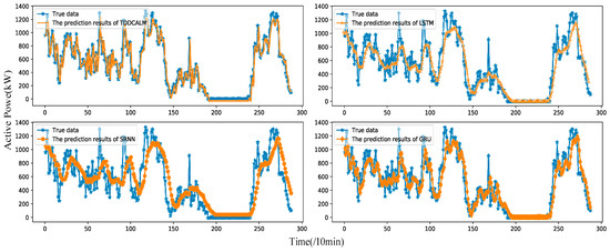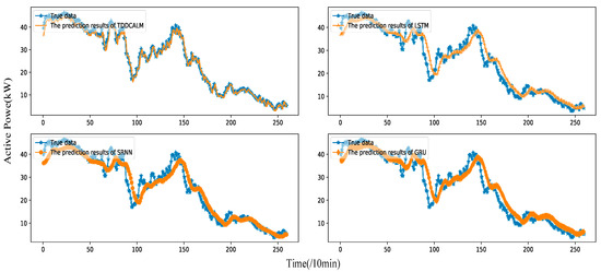 To further verify the reliability of TDDCALM with large datasets, identical hyperparameters were set for all models, with 16 epochs and a learning rate of 0.01. The prediction results of TDDCALM and RNNs on test sets from datasets A and B are shown in Figure 6 and Figure 7.