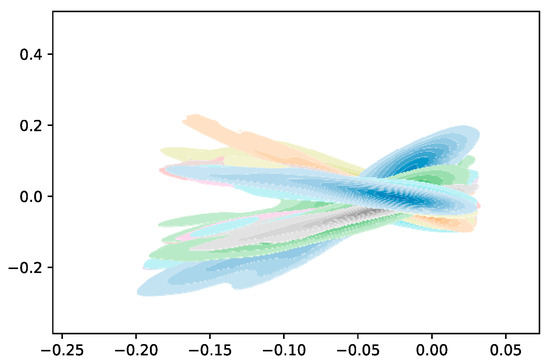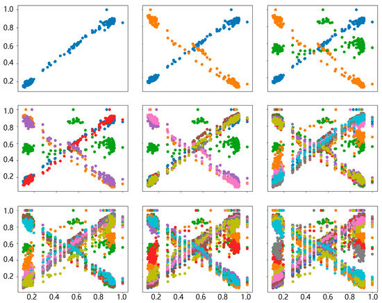 To further clarify relationships between different features, the second-order first-dimension feature is plotted against other dimensions using kernel density estimation, as shown in Figure 9. The x-axis and y-axis represent the numerical values of other dimensions and the first dimension, respectively. The deepest color regions in the kernel density whirlpools indicate the highest density areas: