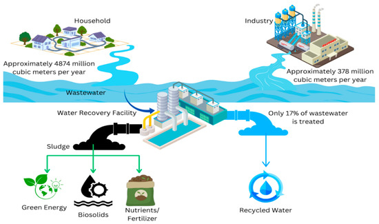 Globally, 380 trillion liters of wastewater are generated every year [1]. In developed countries, about 70% of wastewater is treated, while this figure drops significantly to just about 8% in the least developed countries [2]. Bangladesh’s agricultural economy has recently seen significant industrial growth, particularly in sectors like textiles. This expansion has increased energy demand and exacerbated environmental impacts, including wastewater management challenges [3,4]. According to the Department of Environment (DoE), only 1773 effluent treatment plants (ETPs) were installed by 2019, and most are not fully operational [5]. In 2015, the country produced an estimated 456 million m3 of wastewater, with only 6% treated [6]. By 2021, wastewater generation reportedly reached 1733.5 million m3, yet only 0.01% was treated [7]. Improperly treated industrial wastewater pollutes major rivers, leading to drinking water contamination and other environmental problems [8].
