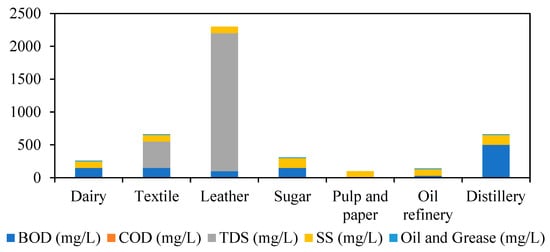 Figure 1 provides a summary of the wastewater generation from key industries in Bangladesh. The average COD of wastewater across industries is 3000 mg/L, which is far exceeding the safe discharge limit set by the DoE in Bangladesh [40]. The textile industry is the largest contributor as it generates approximately 288 million cubic meters of wastewater annually. The COD values of this industry range from 1200 to 1750 mg/L [41]. The leather industry, concentrated in the Hazaribagh area of Dhaka, contributes 30 million cubic meters of sludge and wastewater annually, with a COD value of 1610–1750 mg/L [42]. This wastewater is particularly hazardous due to the presence of heavy metals like chromium, cadmium, and lead, which pose severe risks to both ecosystems and human health [43]. The pharmaceutical sector, although it produces only 1 million m3 of sludge annually, lacks a comprehensive wastewater management policy, leading to uncontrolled sludge disposal in farmlands and rivers [44].