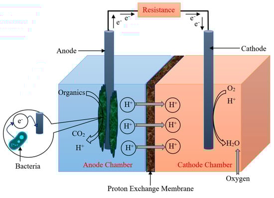 A typical MFC consists of two main compartments, an anode and a cathode, separated by either a proton exchange membrane (PEM) or an ion exchange membrane. This membrane allows only protons or hydroxyl ions to pass, thereby preventing compartment mixing and ensuring maximum power output [60]. A schematic representation of a simple dual-chamber MFC is illustrated in Figure 4.