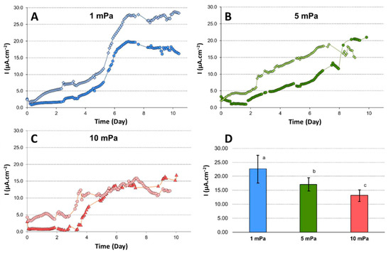 Current density produced as a function of time in the conditions of 1 mPa (A), 5 mPa (B), and 10 mPa (C). Average current density between 8 and 10 days (D). (Adapted with permission from [98]. Copyright: 2023 Elsevier).