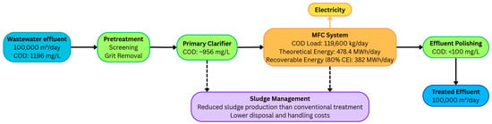 Dhaka, the capital of Bangladesh, with a population of over 20 million, generates approximately 1.5 million cubic meters of wastewater daily from about 7000 industrial units in nearby areas [100]. With most industries established in Dhaka, its wastewater primarily originates from domestic, industrial, and commercial sources; only about 20–50% is treated by conventional methods like aerobic digestion [101]. The untreated wastewater, with an average biochemical oxygen demand (BOD) concentration of 276 to 425 mg/L, significantly contributes to the pollution of the Buriganga River and other water bodies [102]. In the proposed case study, we focus on deploying MFC technology to treat 100,000 m3/day of wastewater in a densely populated industrial zone of Dhaka. This scenario aligns with previous studies that suggest MFCs can be scaled to manage large wastewater volumes while recovering energy and reducing environmental pollutants [103]. The overall wastewater treatment and energy generation process of the MFC plant is shown in Figure 6.