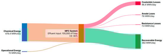 This energy could provide electricity to thousands of homes in the Dhaka region. However, due to efficiency losses in real-world conditions, only a portion of this theoretical energy can be recovered. For a coulombic efficiency of 80% [105], the recoverable energy would be around 382 MWh/day. The energy balance of the MFC plant is depicted in Figure 7 with a Sankey diagram.