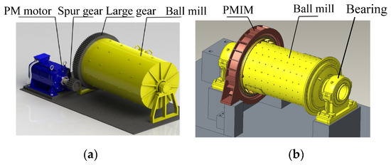 Ball mill drive system. (a) Traditional drive mode. (b) PMIM direct drive.