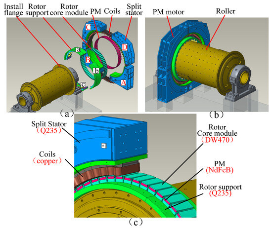 Due to the pre-arrangement of the roller on-site, all components of the motor are installed around the roller, leading to the modular design of the PMIM for ball mills. As shown in Figure 1, the rotor support is mounted on the flange in a split configuration (with the rotor support divided into parts a, b, and c). The rotor core is affixed to the outer circumference of the rotor support, while the permanent magnet (PM) is inserted into the rotor iron core. The stator is also installed on the foundation in a split form, as depicted in the illustration, which shows the stator divided into parts A, B, C, and D.