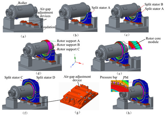 Schematic diagram of 3D structure of non-magnetic assembly. (a) Install air-gap adjustment devices (b) Install split stator A (c) Install split stator B (d) Install rotor support (e) Install rotor core (f) Install split stator C and D (g) The structural of air-gap adjustment devices (h) Install PM.
