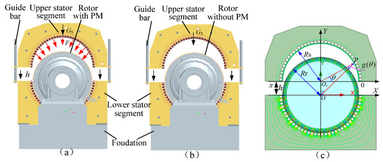 The assembly models of the PMIM for ball mills include both magnetic and non-magnetic assemblies, as illustrated in Figure 5. The magnetic assembly model comprises four main components: the guide bar, stator segments, rotor with permanent magnets (PMs), and an installation platform. In contrast, the non-magnetic assembly model substitutes the rotor with one that lacks permanent magnets. In the magnetic assembly configuration, the guide bar serves not only as a guide but also provides support to the stator segments to counteract the electromagnetic attraction between the stator and rotor. Conversely, in the non-magnetic assembly, the guide bar functions solely as an alignment guide. It is noteworthy that, during magnetic assembly, the electromagnetic attraction force (F) between the upper stator segment and the rotor with PM gradually increases as the stator approaches the rotor, necessitating the guide bar to bear the resultant indirect load. In the non-magnetic assembly state, the upper stator segment is solely subjected to its own gravitational force (GS), allowing it to descend smoothly along the guide bar and complete the closure.
