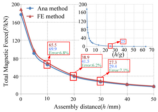 A comparison between analytical and finite element analysis results of the total magnetic pull force F during magnetic assembly at different assembly distances h is shown in Figure 6. The total magnetic pull force of the stator, as calculated by the analytical solution, aligns closely with the results obtained from the finite element method. The magnetic pull force acting on the stator increases as the distance h decreases and reaching its maximum when assembly is completed. When h/g > 25, the magnetic pull force on the upper stator approaches zero; when h/g < 25, the magnetic pull force on the upper stator begins to increase rapidly and the influence of magnetic forces must be considered in design and assembly.