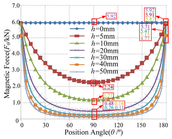 Figure 7 illustrates the distribution of magnetic pull forces at any point on the inner surface of the upper stator. It is observed that the load on the inner surface of the upper stator initially decreases and then increases within the range of 0 to π when h ≠ 0, exhibiting symmetry on both sides. Conversely, when h = 0, the load on the inner surface of the upper stator remains constant across the range of 0 to π.