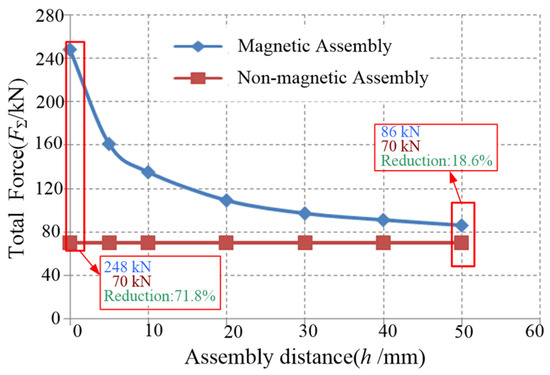 The distribution of the total load on the upper stator at varying assembly distances (h) under both magnetic and non-magnetic assembly conditions is illustrated in Figure 8. It is evident that, under magnetic assembly conditions, a decrease in the assembly distance (h) leads to a significant increase in the total load on the stator. In contrast, under non-magnetic assembly conditions, the total load remains stable. Specifically, as the assembly distance is reduced from 50 mm to 0 mm, the load for non-magnetic assembly remains constant at 70 kN, while the total load for magnetic assembly fluctuates between 86 kN and 24 kN. Comparative analysis reveals that non-magnetic assembly can reduce the total load by 18.6% to 71.8% relative to magnetic assembly.
