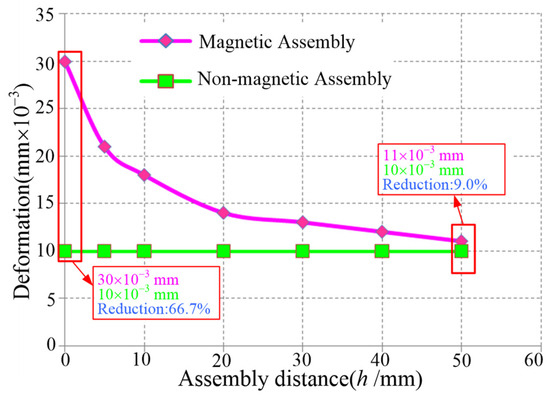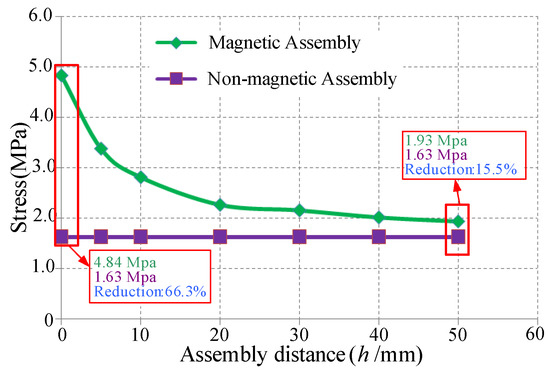 The distribution curves of stress and deformation at various hoisting distances (h) are illustrated in Figure 9 and Figure 10. It is evident that the distribution trends of both stress and deformation align with the overall load variation. When the hoisting distance is decreased from 50 mm to 0 mm, the maximum stress of the non-magnetic assembled stator decreases by 15.5% to 66.3% compared to that of the magnetic assembled stator, while the deformation accounts for only 9.0% to 66.7% of that of the magnetic assembled stator.