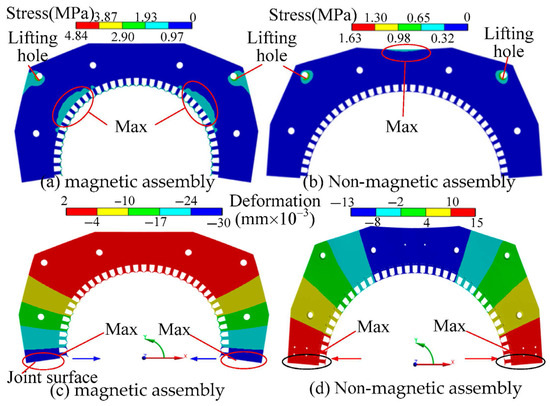 In the case of the magnetic assembly, magnetic drag serves as the primary load, with the maximum stress concentrated around the stator tooth corresponding to the lifting hole, as illustrated in Figure 11a. The maximum deformation occurs at the joint surface, with the deformation direction pointing toward the center of the circle, consistent with the magnetic drag, as shown in Figure 11c. Conversely, for the non-magnetic assembly, it is solely subjected to gravitational load, resulting in the maximum stress distributed at the upper part of the stator, as depicted in Figure 11b. The maximum deformation is also located at the joint surface; however, the direction of deformation radiates outward. This phenomenon can be attributed to the arch structural characteristics of the stator: under the influence of self-weight, the load is transmitted through the arch path, producing an outward load component at the joint surface and causing outward deformation, as shown in Figure 11d.