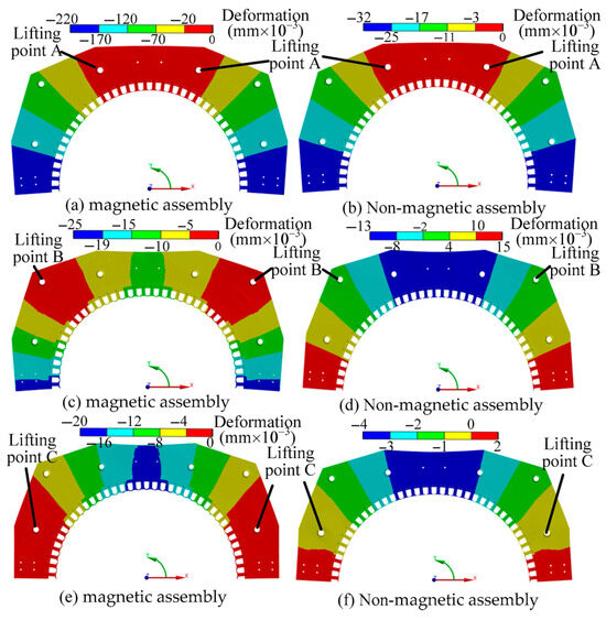 The finite element analysis results of magnetic and non-magnetic assemblies at different lifting positions A, B, and C are presented in Figure 12. It is evident that the displacement of the non-magnetic assembly is consistently less than that of the magnetic assembly across all lifting positions. Specifically, the non-magnetic assembly technology reduces the deformation of the stator assembly by 48% to 85%. As the lifting point descends, the deformation of the upper stator exhibits a significant decreasing trend. By optimizing the position of the lifting point, the adverse deformation of the stator generated during the motor assembly process can be effectively mitigated, thereby enhancing the accuracy and quality of the assembly.