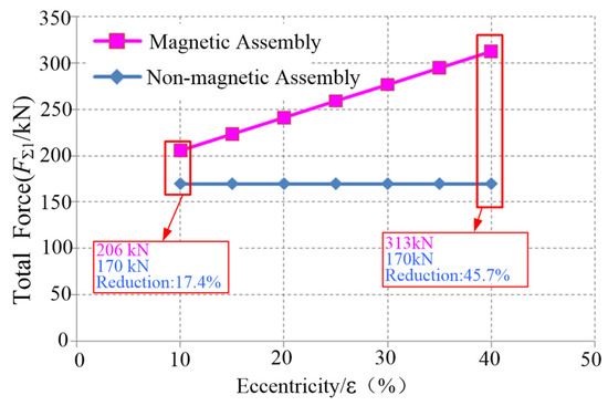 As illustrated in Figure 13, the total load required for adjusting the stator increases with the eccentricity during magnetic adjustment, while it remains constant during non-magnetic adjustment. Specifically, when the eccentricity varies from 10% to 40%, the total load for non-magnetic adjustment consistently stays at 70 kN. In contrast, the total load required for magnetic adjustment escalates from 206 kN to 313 kN. Notably, the load that must be overcome during non-magnetic adjustment constitutes only 17.4% to 45.7% of the load experienced during magnetic adjustment.