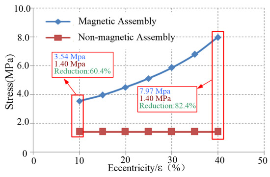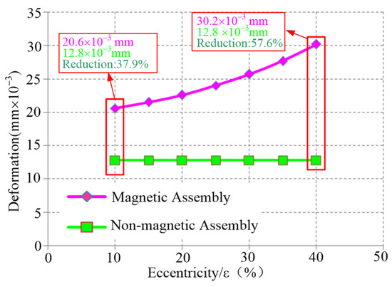 As illustrated in Figure 14 and Figure 15, when the eccentricity varies from 10% to 40%, the maximum stress of the stator without magnetic adjustment is 60.4% to 2.4% lower than that with magnetic adjustment. Additionally, the maximum deformation of the stator is between 37.9% and 57.6% of that observed with magnetic adjustment.
