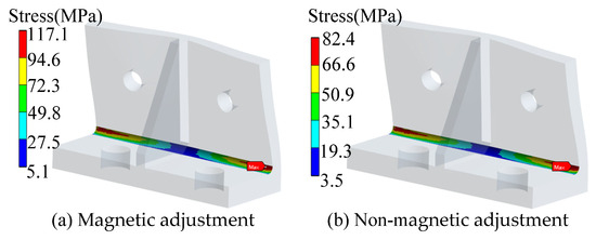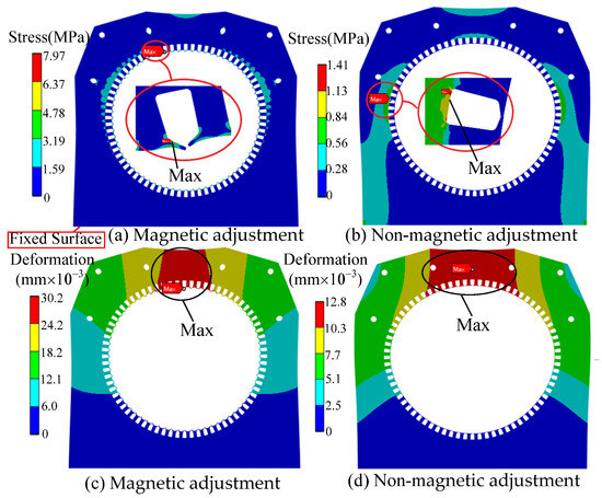 The stress and deformation finite element distribution cloud map with magnetic air gap adjustment and without magnetic gap adjustment are shown in Figure 16.