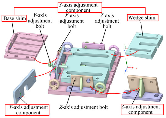 As illustrated in Figure 17, the air gap adjustment device comprises three primary components: the X-axis adjustment component, the Y-axis adjustment component, and the Z-axis adjustment component. The adjustment and control of the air gap are achieved by configuring adjustment bolts in each direction. Notably, the Y-axis adjustment component consists of a base shim and a wedge shim.