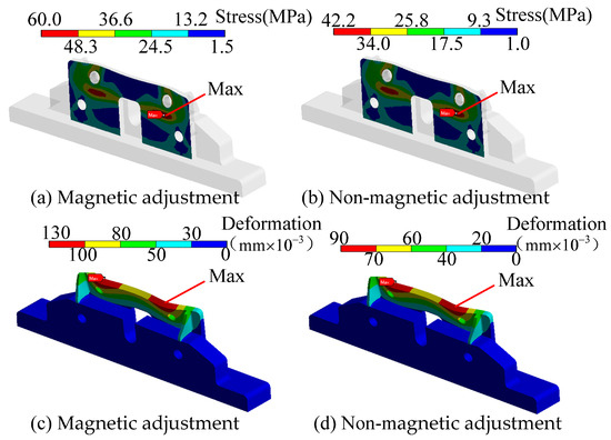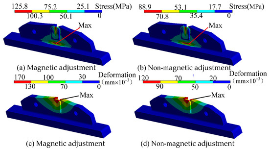 The stress and deformation finite element distribution cloud map of magnetic assembly and non-magnetic assembly are shown in Figure 11.