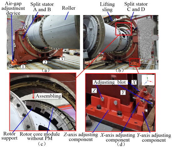 The photographs depicting the on-site assembly without permanent magnets are presented in Figure 23. Figure 23a illustrates the installation of the air gap adjustment device and the lower stator surrounding the roller. Figure 23b,c depict the assembly of the rotor support, the rotor module, and the lifting of both the upper and lower stators for assembly. At this stage, the rotor does not contain permanent magnets; thus, the assembly process is unaffected by magnetic attraction. As shown in Figure 23b, it is unnecessary to establish a guiding device to prevent the attraction of the stator and rotor during assembly; the process can be completed using only a single crane. Figure 23d displays the air gap adjustment device. The motor can be maneuvered in all directions by adjusting the bolts, thereby enhancing the uniformity of the air gap within the motor.