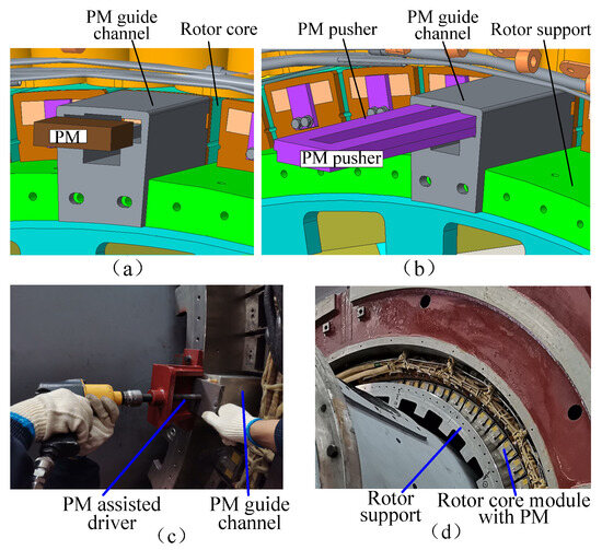 As shown in Figure 24a, a PM guide channel is implemented during assembly to eliminate magnetic interference from stator/rotor structures on PM installation. As shown in Figure 24b,c, using a PM pusher and PM-assisted driver, the permanent magnets are sequentially mounted into rotor core modules through the PM guide channel. Figure 23d displays the fully assembled motor with all permanent magnets installed. It is important to note that the material of the permanent magnet push rod is nylon, while the material of the permanent magnet pipeline is stainless steel. Additionally, the clearance between the permanent slot and the permanent magnet must be maintained within a range of 0.1 to 0.2 mm.
