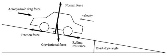 - Vehicle dynamics: The simulated vehicle used in this research corresponds to a standard electric passenger car which shows similar attributes to actual market-ready EVs like the Nissan Leaf and Hyundai Ioniq. The key vehicle parameters, including the mass, drag coefficient, frontal area, and rolling resistance coefficient, were selected from validated studies and datasets in the literature [25] to ensure realistic performance. The vehicle dynamics were analyzed using formulas that account for the vehicle’s mass, road–tire interaction, air resistance, and road inclination. These factors collectively influence the forces acting on the vehicle, enabling precise predictions of its longitudinal motion. Figure 4 presents a free-body diagram (FBD) illustrating the forces acting on a vehicle moving on an inclined plane. Several forces were considered in this analysis. Gravitational force acts downward and has a component along the incline calculated as the product of the vehicle mass, gravitational acceleration, and the sine of the road slope angle; normal force is exerted by the road surface perpendicular to the incline, balancing the perpendicular component of gravity; rolling resistance opposes motion due to the tire–road interaction and depends on the normal force; aerodynamic drag acts in opposition to the vehicle’s motion and is influenced by wind velocity; traction force is required to overcome resistive forces and accelerate the vehicle; propulsion force is generated by the powertrain and transmitted through the wheels.