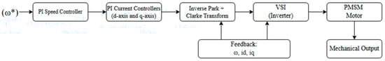 Figure 5 illustrates the field-oriented control (FOC) structure implemented in the Simulink environment for the PMSM drive. The outer loop includes a PI speed controller that compares the reference speed with the actual motor speed , producing a reference q-axis current . This value, along with a constant or zero d-axis current reference , is fed into the inner current control loop. Two PI controllers regulate the stator current errors to generate reference voltages and , which are transformed through inverse Park and Clarke transformations before being applied to the voltage source inverter (VSI). The inverter generates the three-phase voltages that drive the PMSM. A feedback loop returns key signals—motor speed and measured d/q-axis currents—to close the loop and enable dynamic torque and flux control.