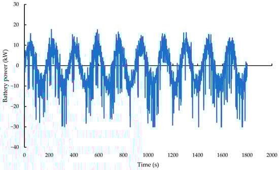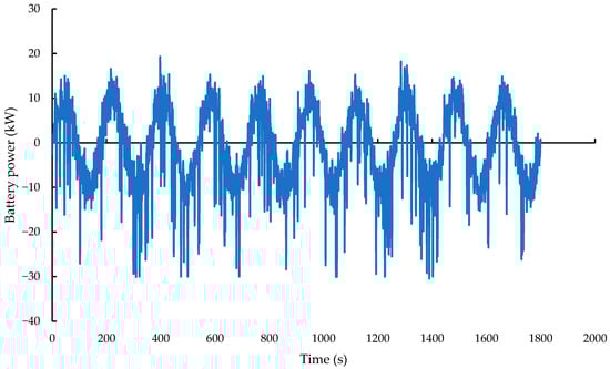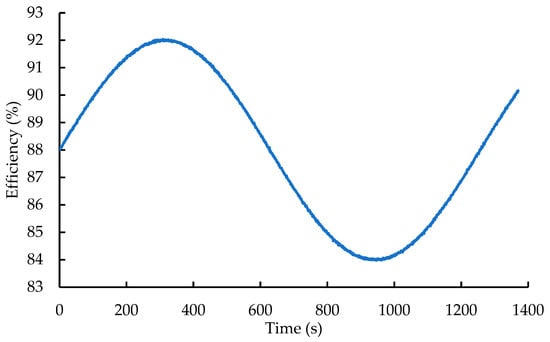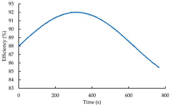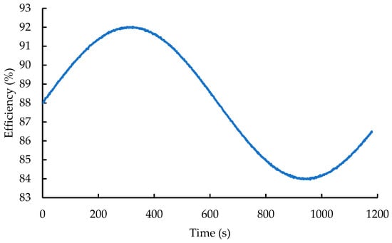 UDDS demonstrates the driving behavior of city zones through numerous stops and starts accompanied by brief acceleration periods. The UDDS cycle extends for 1370 s through multiple speed variations that involve continuous starting and stopping. Figure 7 illustrates the PMSM’s operational efficiency during the entire UDDS duration. The repeated load transitions during motor operation lead to variations in torque together with speed conditions, resulting in significant changes to efficiency. Efficiency peaks briefly during low-load cruising conditions, but the average efficiency rate remains lower than highway cycles.