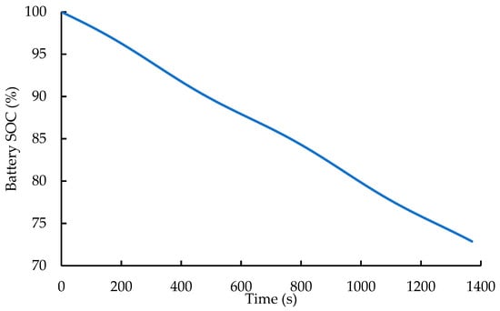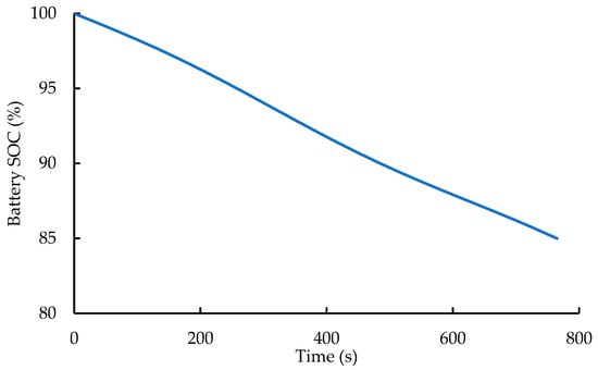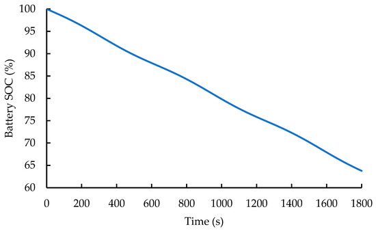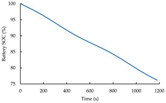 Figure 8 displays the SOC profile during the UDDS cycle. The battery discharges steadily due to the constant stop-and-go behavior, which requires frequent bursts of power. However, SOC increases slightly during regenerative braking phases, particularly in deceleration events following acceleration spikes. These recoveries highlight the importance of effective regeneration in urban environments.
