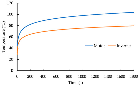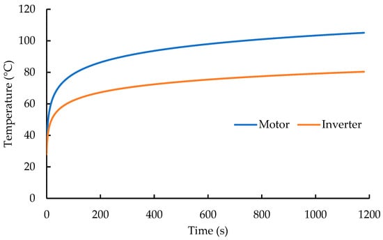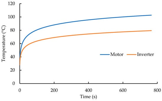 This study utilized the Simulink environment to integrate thermal models based on lumped-parameter networks for analyzing both motor and inverter thermal behavior. The simulation models assess the temperature change of components under standard driving cycles by analyzing internal power loss signatures. Understanding thermal responses provides important information about energy efficiency along with component stresses, potential thermal derating requirements, and protection methods. The thermal modeling method employs resistance–capacitance (RC) equivalent circuits that depict electrical losses as heat sources which transmit heat through thermal resistances until they reach ambient temperature. The modeling approach treated each component as a single thermal node equipped with internal heat-generation capability and thermal time constants determined by their associated capacitances.