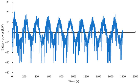 - Auxiliary loads: An auxiliary loads block is included in the system architecture to account for non-propulsion electrical consumers such as HVAC, lighting, infotainment, and onboard electronics. In this simulation, the auxiliary load was modeled as a constant power drain of 700 W across all driving cycles, reflecting typical values reported for compact EVs. This ensures that total battery power consumption includes realistic background loads, thereby improving the fidelity of energy consumption results.