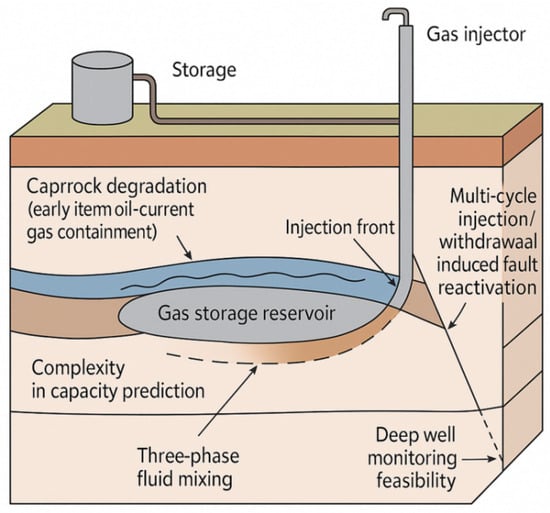 Converting mature oilfields, particularly depleted oil and gas reservoirs, into underground gas storage (UGS) facilities is an important and increasingly common approach for UGS development. Depleted reservoirs offer several advantages for such conversions, including well-characterized geological conditions, the potential for reutilizing existing infrastructure—especially wells—an abundance of geological and engineering data accumulated during hydrocarbon exploration and production, and a preliminary validation of caprock sealing integrity [9,10,11,12]. However, compared to rigid storage media such as salt caverns, depleted reservoirs exhibit significant evolution of reservoir pressure fields and in situ stress fields during long-term cyclic injection and production operations. These dynamic changes may result in the reactivation of pre-existing faults and the propagation of microfractures through the caprock, thereby increasing the risk of gas leakage and compromising the overall sealing capacity of the storage system. This risk is particularly pronounced when the original reservoir was designed for liquid hydrocarbon containment rather than for gas storage, where the sealing conditions for gaseous phases impose more stringent requirements. These challenges highlight the necessity for continuous geomechanical monitoring and integrity assessments in reservoir-based UGS facilities [9,13,14].