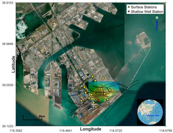 Integrated layout of microseismic observation stations and geological background at the No. 2 UGS facility in the Jidong Oilfield. Yellow and red triangles represent surface and shallow borehole geophone stations, respectively. The background image is a satellite photograph with overlaid structural faults (black lines), color-coded reservoir boundaries, geographic coordinates, and a location inset showing the regional context within northern China.