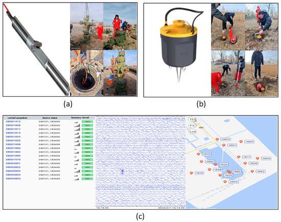 Field deployment of seismic stations: (a) Surface station: a three-component geophone installed using shallow burial in unconsolidated soil, with manual excavation and backfilling. (b) Borehole station: deployment of a downhole geophone array into a pre-existing well, using steel cables and mechanical winches. (c) Mobile interface: real-time transmission and visualization of seismic waveform data via a mobile application.