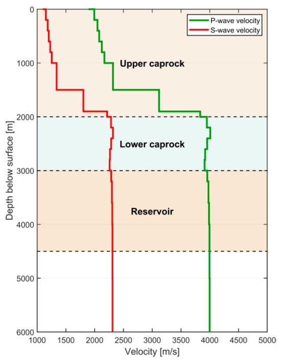 One-dimensional layered velocity model with three lithological units: upper caprock (0–2000 m), lower caprock (2000–3000 m), and reservoir (3000–4500 m). Colored backgrounds denote stratigraphic zones; black dashed lines indicate major geological boundaries. Velocity profiles are based on well logging data.