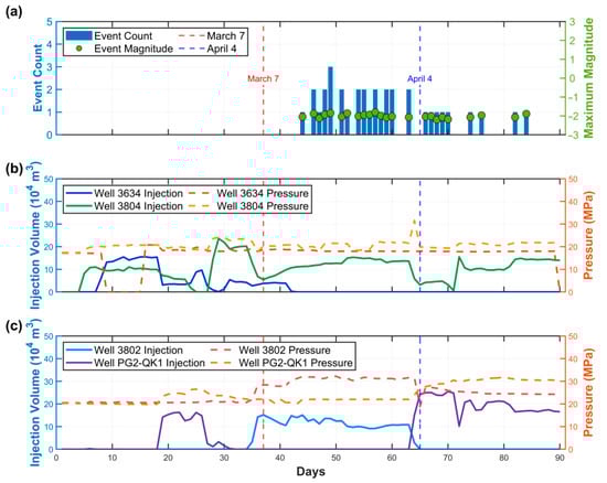 (a) Frequency and maximum magnitude of recorded microseismic events; (b) injection volume and wellhead pressure profiles for wells 3634 and 3804; (c) injection volume and wellhead pressure profiles for wells 3802 and QK1.