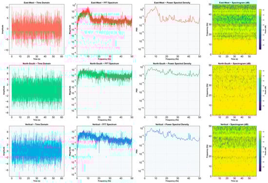 Three-component spectrum analysis of Station 01 recorded in the Eastern Hebei Region on 8 April 2024, showing time-domain signals, FFT spectra, power spectral densities (PSD), and spectrograms for the east–west, north–south, and vertical components.