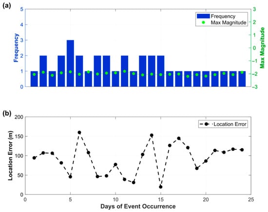(a) Daily microseismic event frequency and maximum magnitude; (b) statistical distribution of event location errors.