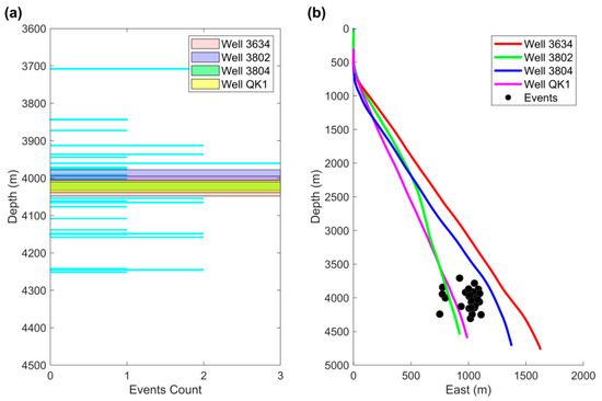 (a) Depth distribution histogram of microseismic events, with colored zones representing the injection intervals of four wells; (b) well trajectories and spatial distribution of microseismic events.